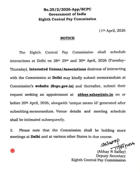рднрд╛рд░рдд рд╕рд░рдХрд╛рд░ рдХреЗ рдЖрдард╡реЗрдВ рдХреЗрдВрджреНрд░реАрдп рд╡реЗрддрди рдЖрдпреЛрдЧ рджреНрд╡рд╛рд░рд╛ рдПрдХ рдорд╣рддреНрд╡рдкреВрд░реНрдг рд╕реВрдЪрдирд╛ рдЬрд╛рд░реА рдХреА рдЧрдИ рд╣реИред рдЬрд╛рд░реА рдиреЛрдЯрд┐рд╕ рдХреЗ рдЕрдиреБрд╕рд╛рд░, рдЖрдпреЛрдЧ 28, 29 рдФрд░ 30 рдЕрдкреНрд░реИрд▓ 2026 (рдордВрдЧрд▓рд╡рд╛рд░ рд╕реЗ рдЧреБрд░реБрд╡рд╛рд░) рдХреЛ рджрд┐рд▓реНрд▓реА рдореЗрдВ рд╡рд┐рднрд┐рдиреНрди рд╕рдВрдЧрдардиреЛрдВ/рд╕рдВрдШреЛрдВ рдХреЗ рд╕рд╛рде рд╕рдВрд╡рд╛рдж (рдЗрдВрдЯрд░реИрдХреНрд╢рди) рдЖрдпреЛрдЬрд┐рдд рдХрд░реЗрдЧрд╛ред