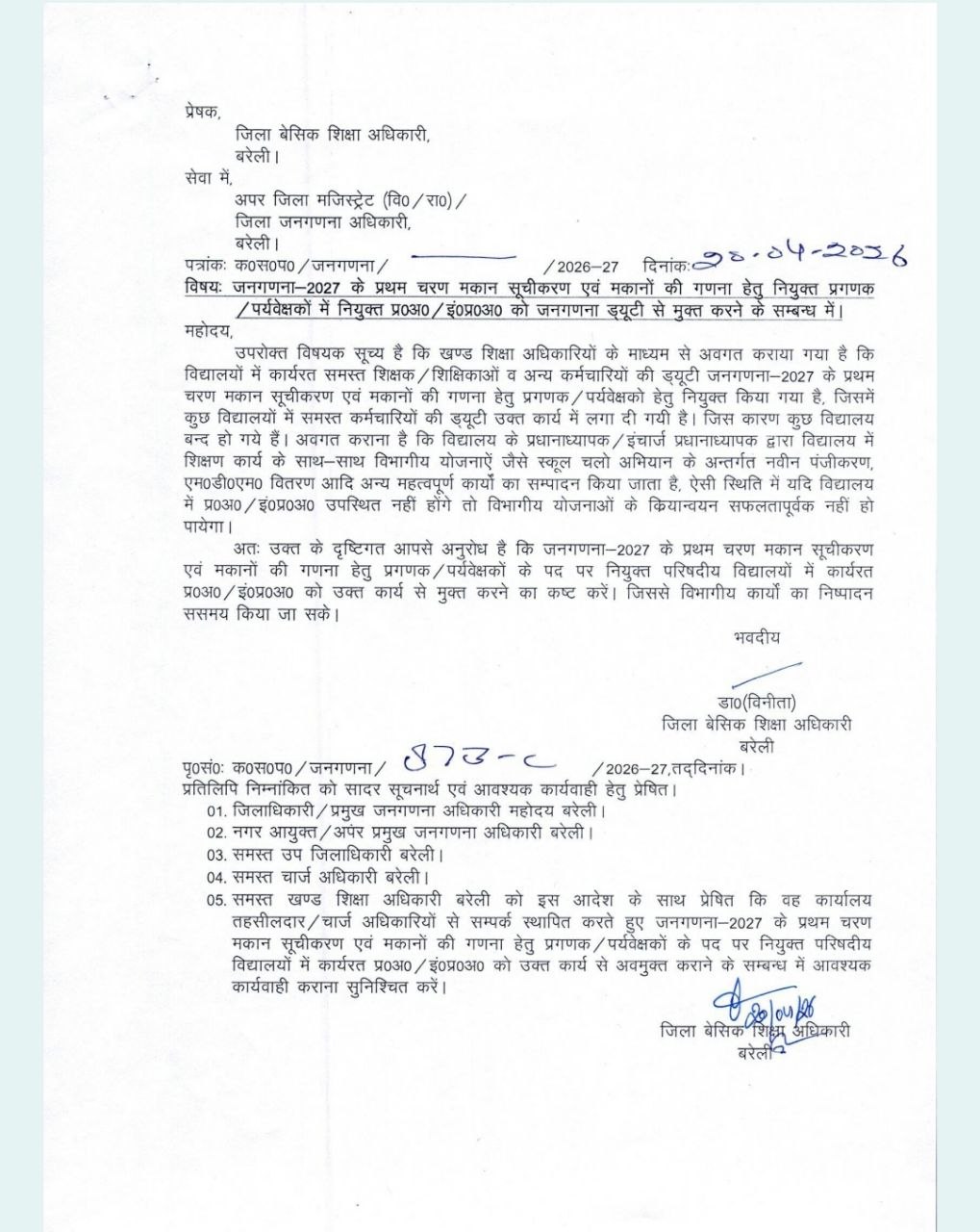 जनगणना–2027 के प्रथम चरण को लेकर बरेली से एक बड़ा प्रशासनिक अपडेट सामने आया है। जिला बेसिक शिक्षा अधिकारी (BSA) बरेली ने एक महत्वपूर्ण पत्र जारी करते हुए जनगणना ड्यूटी में लगे परिषदीय विद्यालयों के प्रधानाध्यापक (प्र0अ0) और इंचार्ज प्रधानाध्यापक (इ0अ0) को इस कार्य से मुक्त करने का अनुरोध किया है।