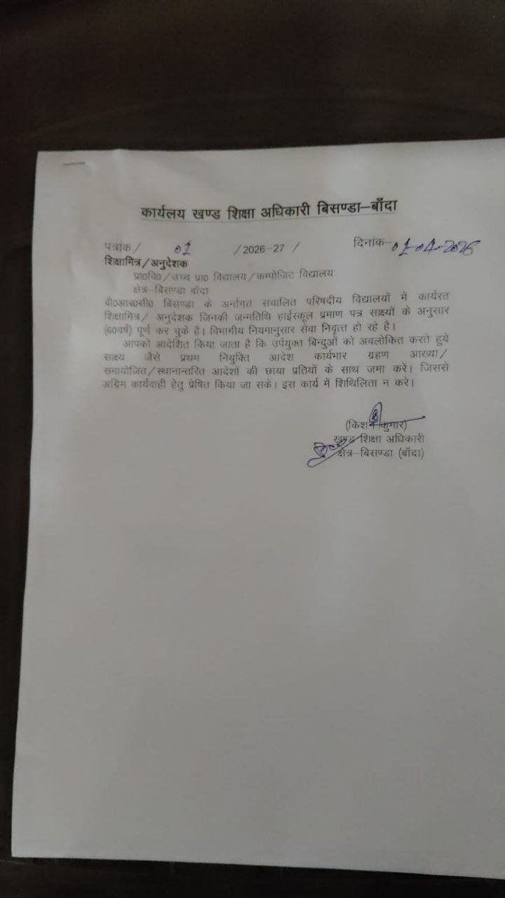 आदेश पर खंड शिक्षा अधिकारी, बिसंडा (बांदा) के हस्ताक्षर भी अंकित हैं, जिससे यह आदेश तत्काल प्रभाव से लागू माना जाएगा।