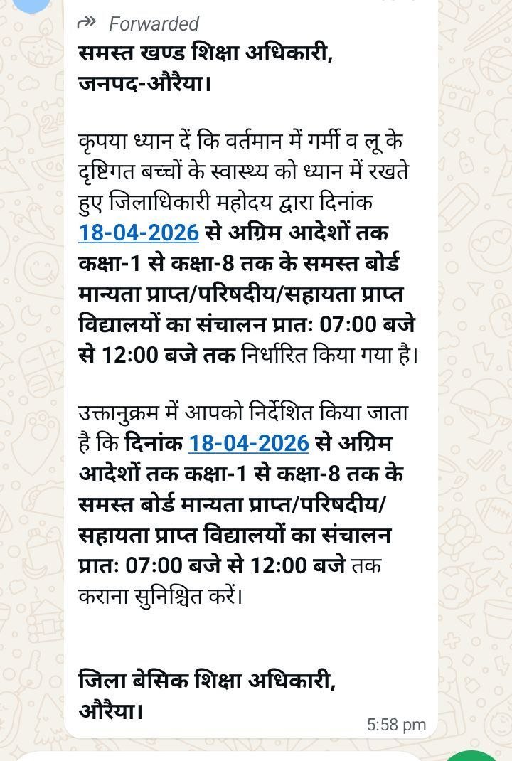 प्राप्त जानकारी के अनुसार, जिलाधिकारी महोदय ने निर्देश दिया है कि दिनांक 18 अप्रैल 2026 से अगले आदेश तक जनपद के सभी बोर्ड से मान्यता प्राप्त, परिषदीय एवं सहायता प्राप्त विद्यालयों (कक्षा 1 से 8 तक) का संचालन नए समय के अनुसार किया जाएगा।