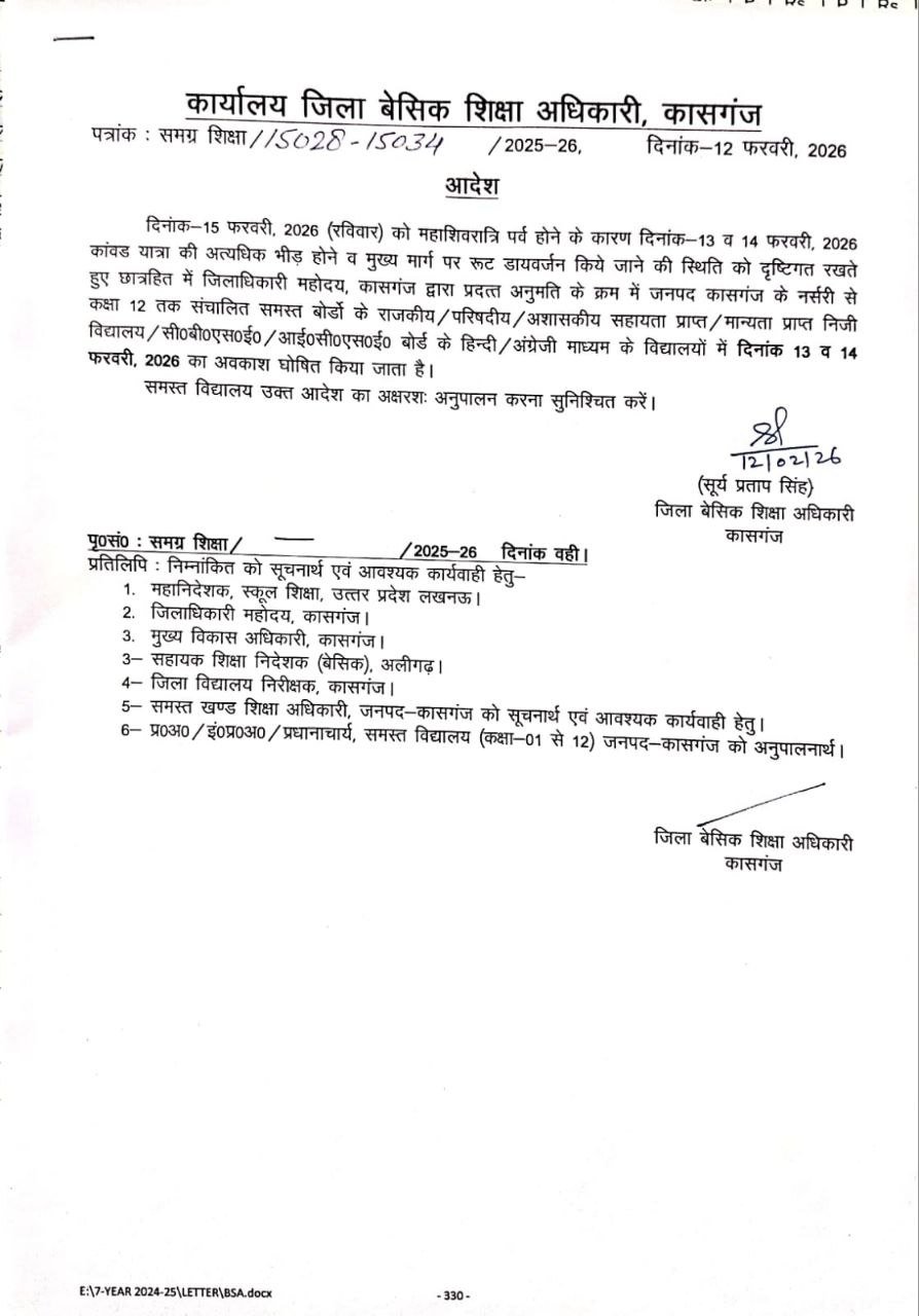 कासगंज, 12 फरवरी 2026 : जिला बेसिक शिक्षा अधिकारी (BSA) कासगंज द्वारा जारी आदेश के अनुसार महाशिवरात्रि पर्व एवं कांवड़ यात्रा के चलते जनपद के सभी विद्यालयों में 13 और 14 फरवरी 2026 को अवकाश घोषित किया गया है। यह निर्णय मुख्य मार्गों पर संभावित भारी भीड़ और रूट डायवर्जन की स्थिति को देखते हुए लिया गया है।
