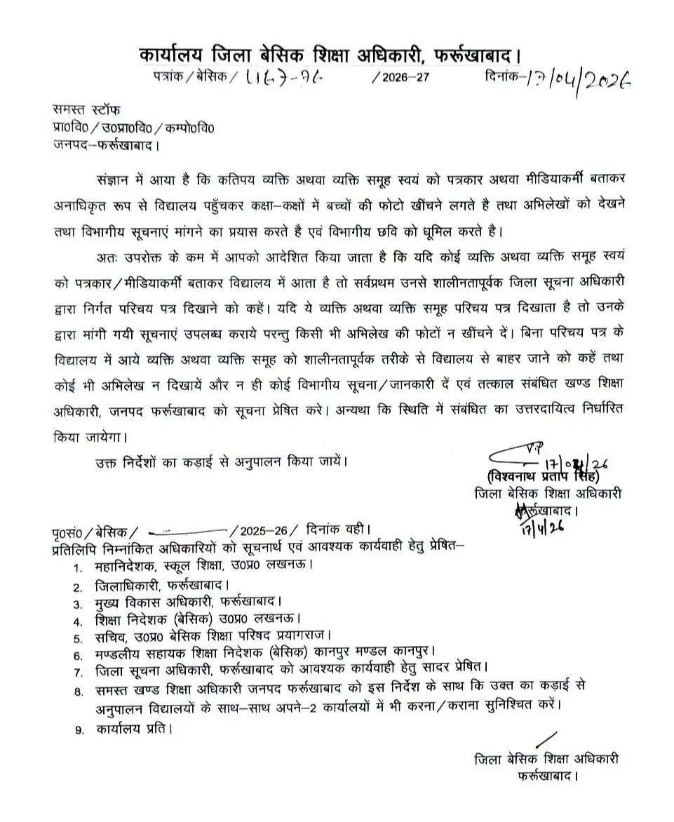 संज्ञान में आया है कि कतिपय व्यक्ति अथवा व्यक्ति समूह स्वयं को पत्रकार अथवा मीडियाकर्मी बताकर अनाधिकृत रूप से विद्यालय पहुँचकर कक्षा-कक्षों में बच्चों की फोटो खींचने लगते हैं तथा अभिलेखों को देखने तथा विभागीय सूचनाएं मांगने का प्रयास करते हैं एवं विभागीय छवि को धूमिल करते हैं।