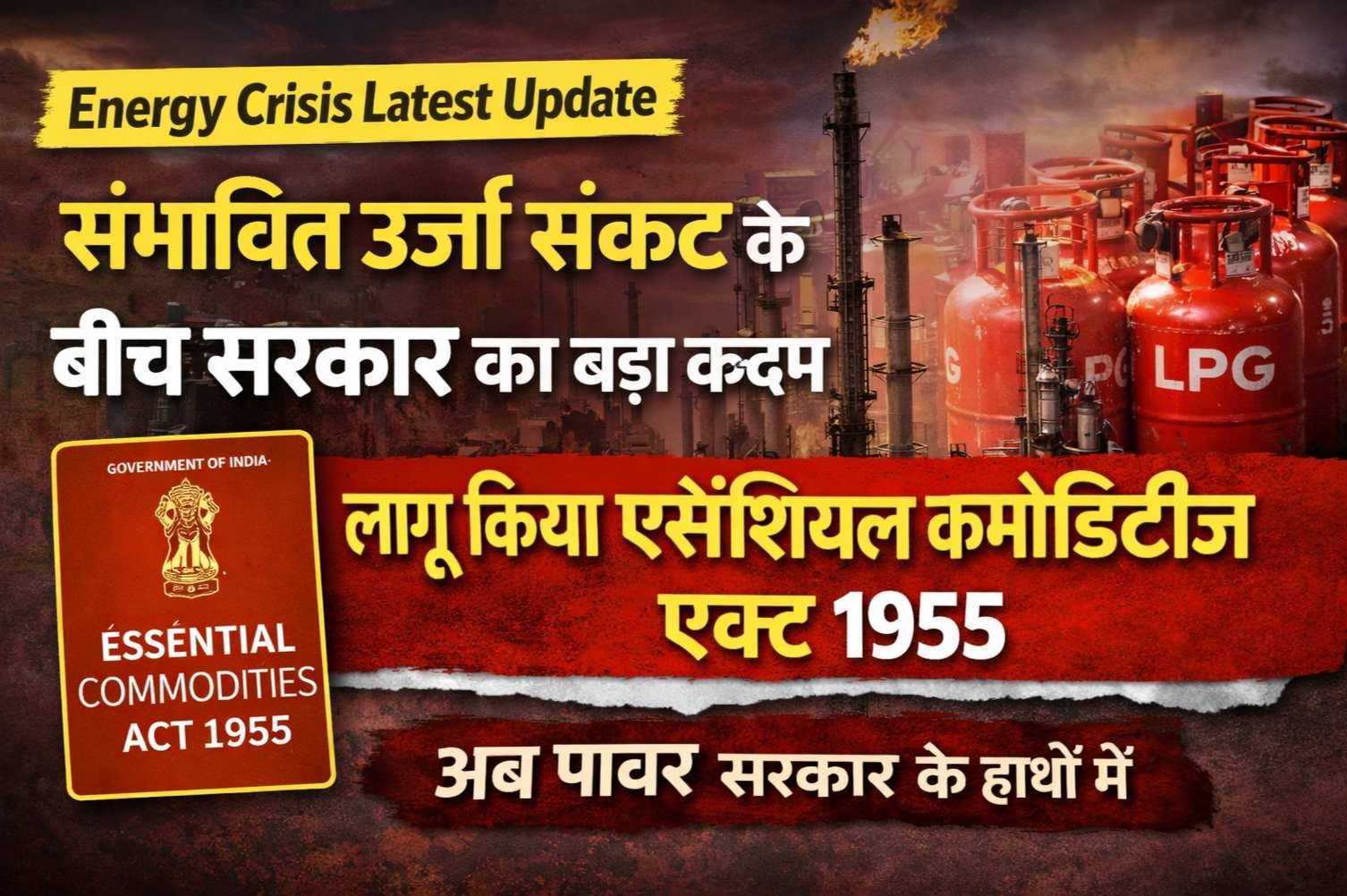दुनिया भर में बढ़ती ऊर्जा अनिश्चितता के बीच भारत सरकार ने एक अहम फैसला लिया है। पश्चिम एशिया में तनाव और तेल सप्लाई को लेकर बन रही परिस्थितियों को देखते हुए केंद्र ने Essential Commodities Act 1955 को लागू करने का निर्णय लिया है।