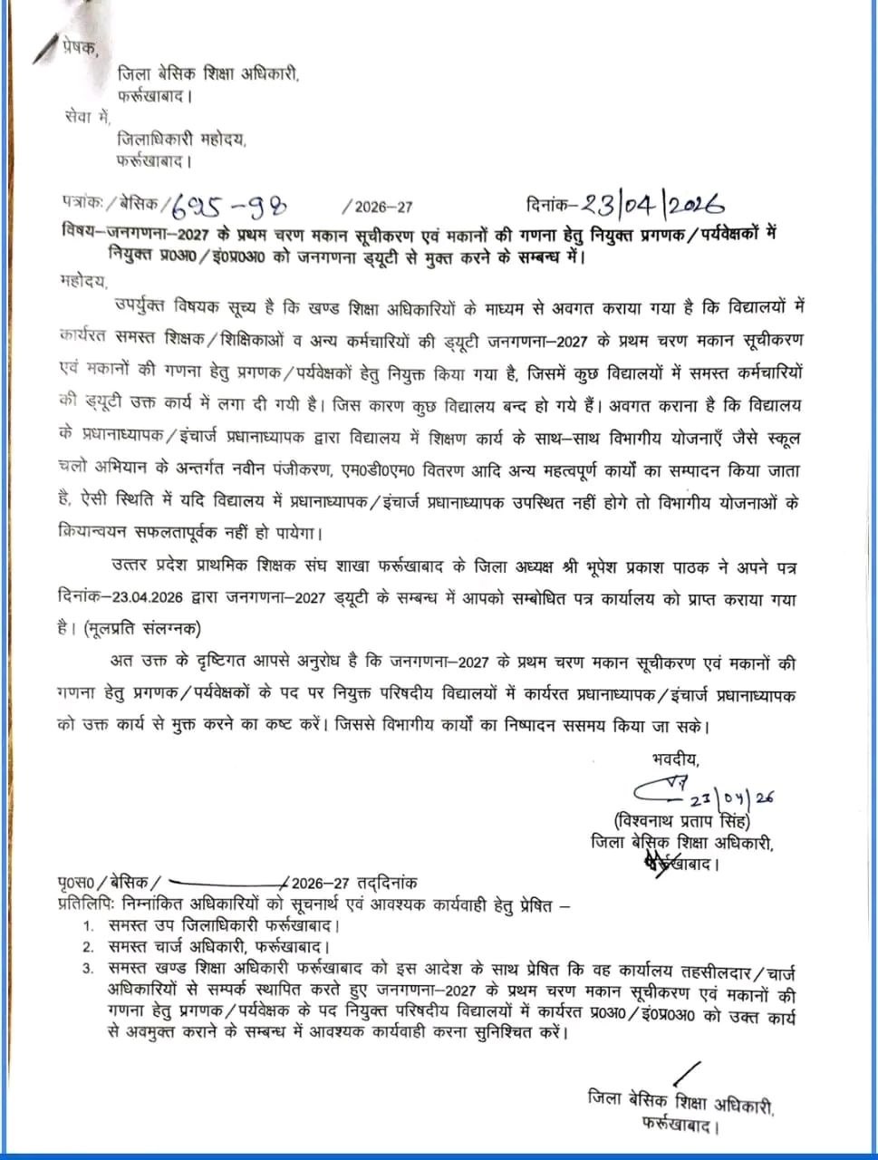 उत्तर प्रदेश प्राथमिक शिक्षक संघ शाखा फर्रुखाबाद के जिला अध्यक्ष श्री भूपेश प्रकाश पाठक ने अपने पत्र दिनांक – 23.04.2026 द्वारा जनगणना-2027 ड्यूटी के सम्बन्ध में आपको सम्बोधित पत्र कार्यालय को प्राप्त कराया गया है। (मूल प्रति संलग्न)