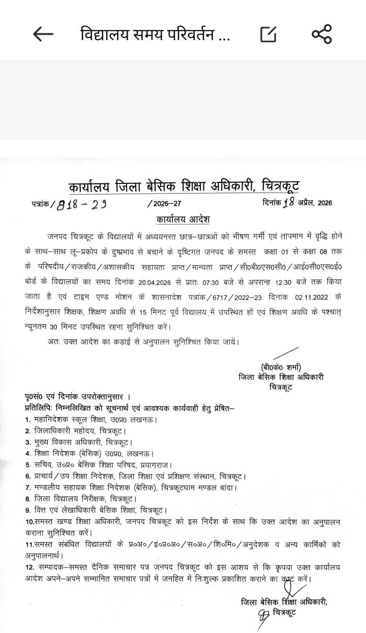 चित्रकूट : भीषण गर्मी और बढ़ते तापमान को देखते हुए जिला बेसिक शिक्षा अधिकारी कार्यालय चित्रकूट ने स्कूल समय में बदलाव का आदेश जारी किया है। जारी निर्देशों के अनुसार, जनपद के कक्षा 1 से 8 तक के सभी परिषदीय, राजकीय, सहायता प्राप्त एवं मान्यता प्राप्त विद्यालय अब 20 अप्रैल 2026 से सुबह 7:30 बजे से दोपहर 12:30 बजे तक संचालित होंगे।