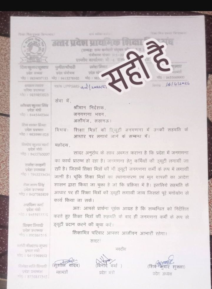 अतः आपसे प्रार्थना पूर्वक आग्रह है कि सम्बन्धित को निर्देशित करते हुए शिक्षा मित्रों की सहमति के बाद ही जनगणना कर्मी के रूप में ड्यूटी प्रदान करने की कृपा करें।