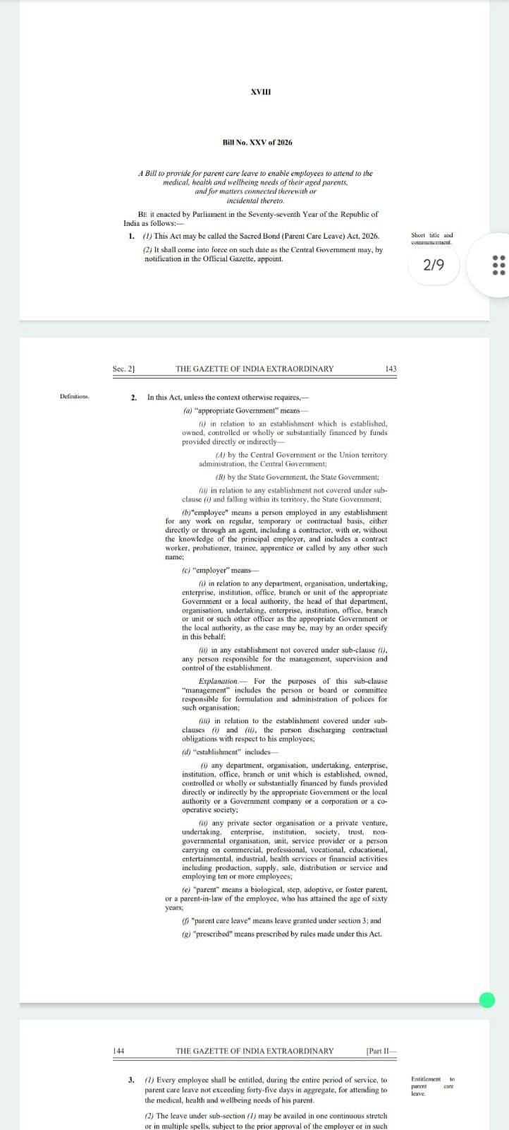 सरकारी कर्मचारियों के लिए parents care leave पर बड़ा update: 45 दिन सवैतनिक छुट्टी का प्रस्ताव: राज्य सभा में बिल पेश : मंजूर