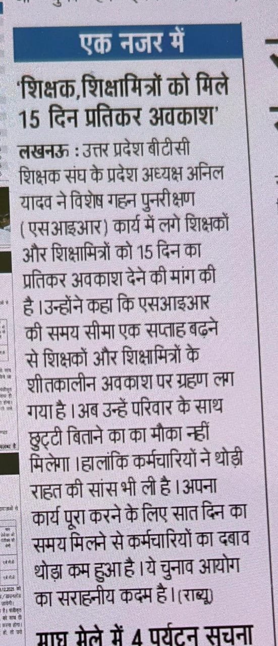 लखनऊ : उत्तर प्रदेश बीटीसी शिक्षक संघ के प्रदेश अध्यक्ष अनिल यादव ने विशेष गहन पुनरीक्षण (एसआइआर) कार्य में लगे शिक्षकों और शिक्षामित्रों को 15 दिन का प्रतिकर अवकाश देने की मांग की है। उन्होंने कहा कि एसआइआर की समय सीमा एक सप्ताह बढ़ने से शिक्षकों और शिक्षामित्रों के शीतकालीन अवकाश पर ग्रहण लग गया है। अब उन्हें परिवार के साथ छुट्टी बिताने का का मौका नहीं मिलेगा। हालांकि कर्मचारियों ने थोड़ी राहत की सांस भी ली है। अपना कार्य पूरा करने के लिए सात दिन का समय मिलने से कर्मचारियों का दबाव थोड़ा कम हुआ है।