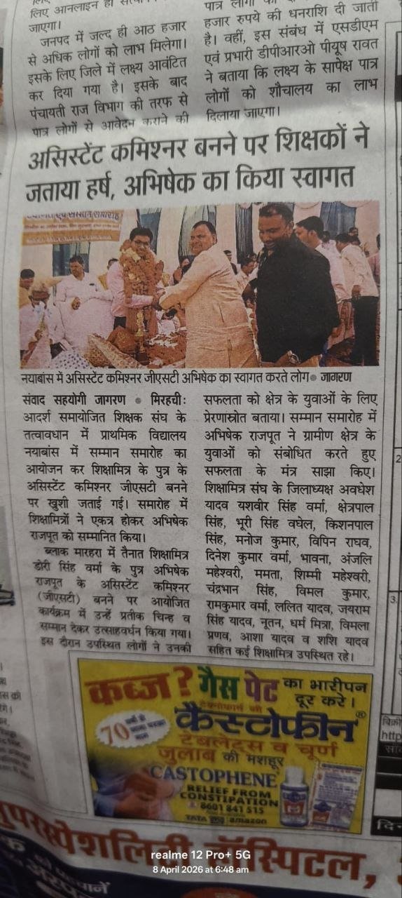 ब्लॉक मारहरा में तैनात शिक्षामित्र डोरी सिंह वर्मा के पुत्र अभिषेक राजपूत के असिस्टेंट कमिश्नर (जीएसटी) बनने पर आयोजित कार्यक्रम में उन्हें प्रतीक चिन्ह व सम्मान देकर उत्साहवर्धन किया गया। इस दौरान उपस्थित लोगों ने उनकी सफलता को क्षेत्र के युवाओं के लिए प्रेरणास्रोत बताया। सम्मान समारोह में अभिषेक राजपूत ने ग्रामीण क्षेत्र के युवाओं को संबोधित करते हुए सफलता के मंत्र साझा किए।