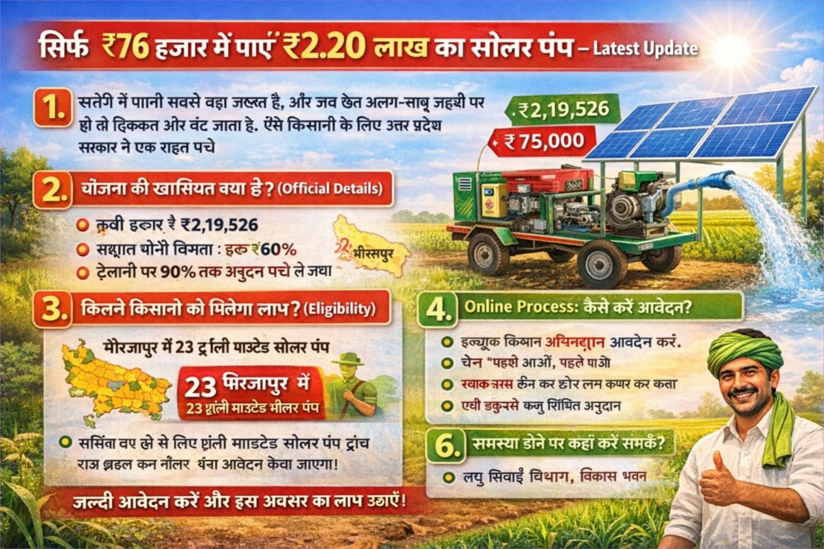खेती में पानी सबसे बड़ी जरूरत है, और जब खेत अलग-अलग जगहों पर हों तो दिक्कत और बढ़ जाती है। ऐसे किसानों के लिए उत्तर प्रदेश सरकार ने एक राहत भरी पहल की है। Latest update के अनुसार मीरजापुर जिले में वित्तीय वर्ष 2025-26 के दौरान ट्रॉली माउंटेड सोलर पंप लगाए जाएंगे, जिससे किसान कम लागत में बेहतर सिंचाई सुविधा पा सकेंगे।