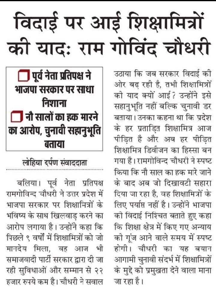 विदाई पर आई शिक्षामित्रों की याद, पूर्व नेता प्रतिपक्ष राम गोविंद चौधरी ने सरकार पर साधा निशाना April 9, 2026 by Ravi Singh विदाई पर आई शिक्षामित्रों की याद, पूर्व नेता प्रतिपक्ष राम गोविंद चौधरी ने सरकार पर साधा निशाना